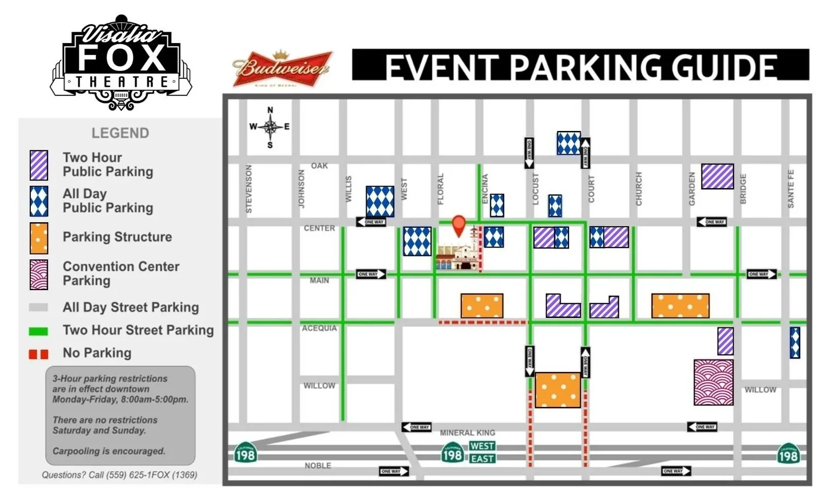 Coming from East 198. Take 198 W and exit W Main St in Visalia. Next, Take exit 107A for State Route 63 N toward Central Visalia/Convention Ctr/Downtown Visalia. Merge onto E Mineral King Ave. Next, Turn right onto S West St. Then turn right on Main Street. The Visalia Fox is located on the left side of the street on the corner of Main and Encina Street.